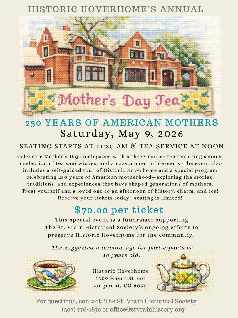 The St. Vrain Historical Society, Inc. (SVHS) is a 501(c)(3) non-profit organization based in Longmont, Colorado, dedicated to preserving the history and heritage of Longmont and the surrounding St. Vrain Valley. The Society’s mission is to “assure a future for our community’s past,” fostering an appreciation of local history and enhancing community engagement. SVHS works to achieve this through historic education, interpretive programming, and the preservation of four key historic sites: Historic Hoverhome, the Hover Farmstead, Old Mill Park, and "Old" St. Stephen’s Church.